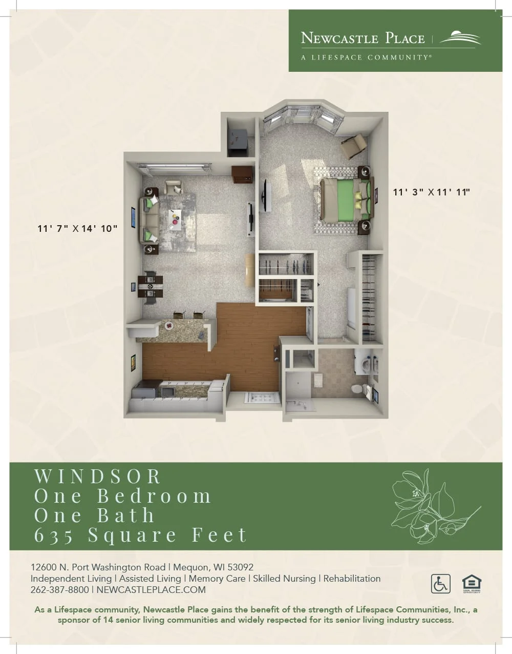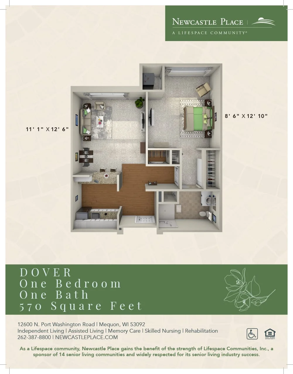 Enjoy your own cozy corner in our community with this 570-square-foot, one-bedroom apartment. This floor plan has modern features fit for elegant living.