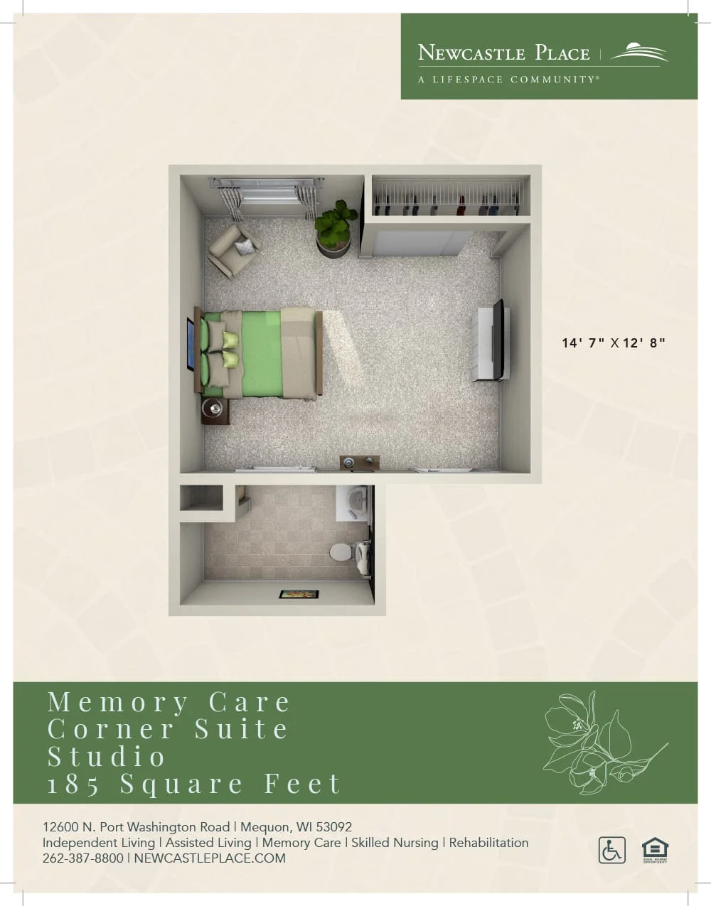 Our most spacious memory care residence, the corner suite studio is 185-square-feet and has its own private bathroom.